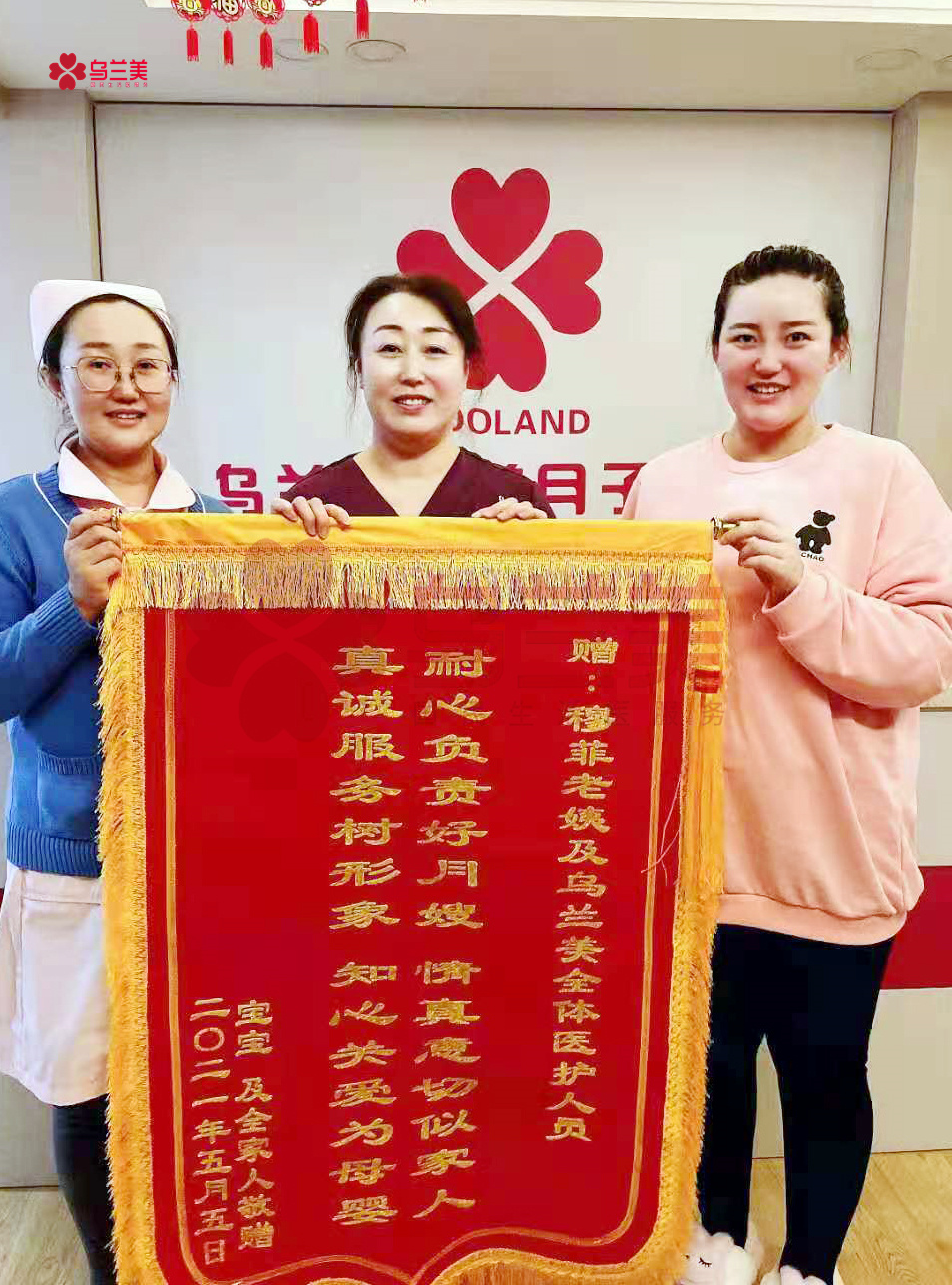 5月5日一大早,烏蘭美醫(yī)養(yǎng)月子中心的每一位母嬰護(hù)理師和工作人員的臉上,都洋溢著幸福的笑容??蛻粼S娜一家將一面印有“耐心負(fù)責(zé)好月嫂,情真意切似家人,真誠服務(wù)樹形象,知心關(guān)愛為母嬰”的錦旗,親自送到了烏蘭美醫(yī)養(yǎng)月子中心母嬰護(hù)理師穆菲(簡稱,穆姐)手里,以此感謝她對(duì)寶媽和寶寶無微不至的關(guān)懷與照護(hù),并對(duì)烏蘭美健康集團(tuán)的正規(guī)和專業(yè)表示了認(rèn)可!