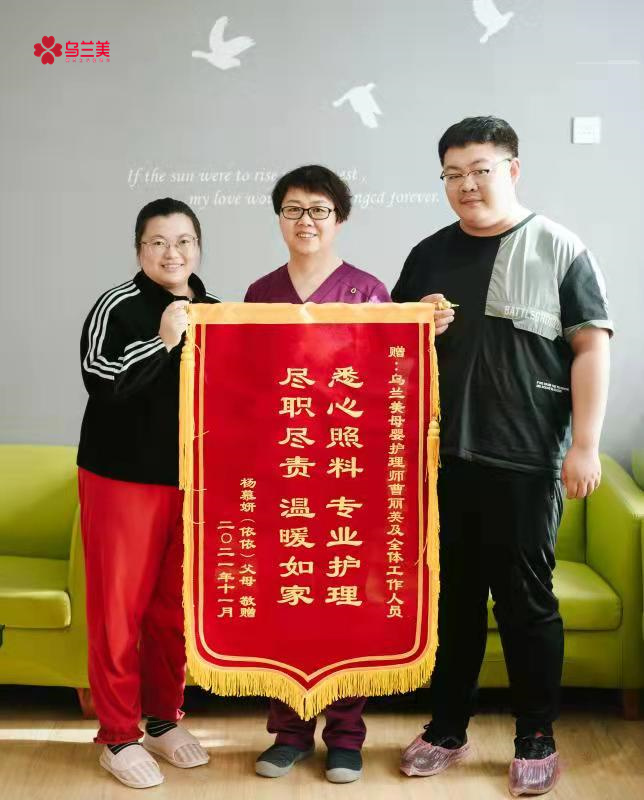 2021年11月即將滿一個(gè)月的月子生活,讓依依寶寶的媽媽難以忘懷,她親身體會(huì)到了烏蘭美醫(yī)養(yǎng)月子中心母嬰護(hù)理師曹麗英無微不至的關(guān)懷和照顧,感受了每一位工作人員飽滿的工作熱情。在寶寶滿月這天,特地給烏蘭美醫(yī)養(yǎng)月子中心準(zhǔn)備了禮物——一面寫著“悉心照料,專業(yè)護(hù)理,盡職盡責(zé),溫暖如家”的感謝錦旗,錦旗充分表達(dá)了寶媽及家屬對(duì)烏蘭美醫(yī)養(yǎng)月子中心所有工作人員及母嬰護(hù)理師曹麗英深切的感激之情。